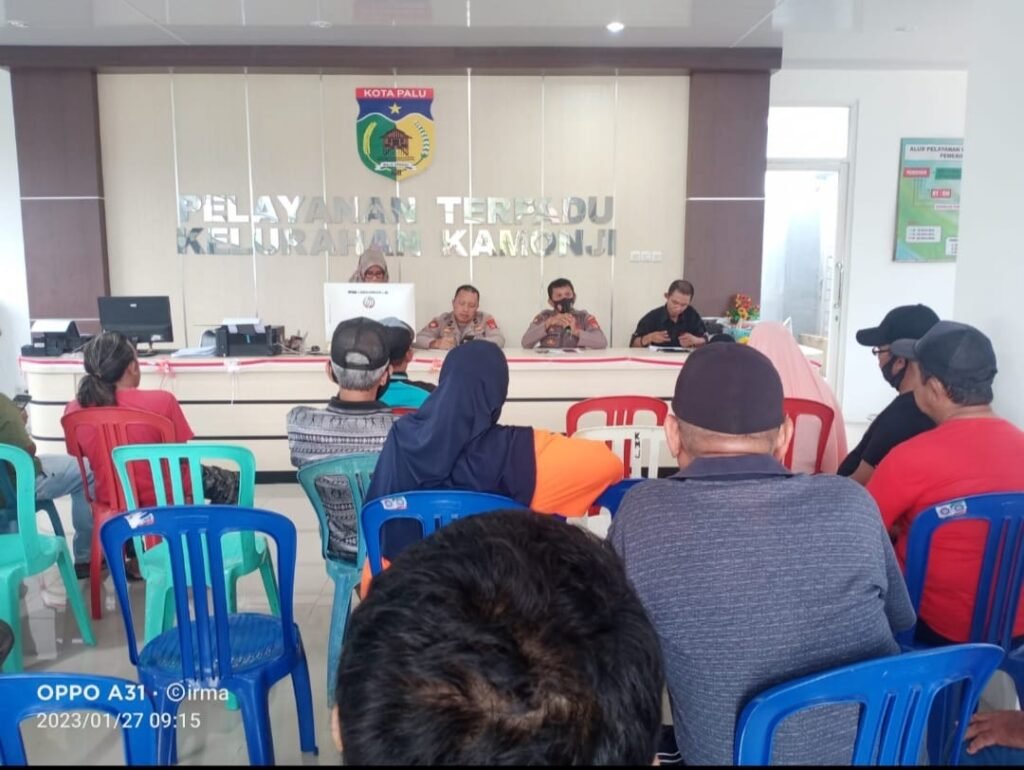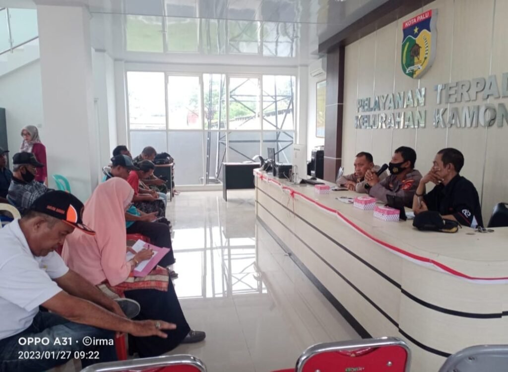 Lurah Kamonji Mohamad Rizal, S. AP bersama Satgas Pancasila, Ketua RT/RW sekelurahan Kamonji serta beberapa perwakilan warga kelurahan Kamonji mengikuti Giat Jumat Curhat yang dilaksanakan oleh Polsek Palu Barat pada Jumat, 27 Januari 2023. Bertempat di Kantor Kelurahan Kamonji, Giat Jumat Curhat ini dipimpin langsung oleh Waka Polsek Palu Barat Iptu Suryadi dan didampingi Kanit Sabhara Ipda Andi Sapada. Giat tersebut merupakan salah satu pogram QW Presisi yang bertujuan mendengarkan aspirasi atau keluhan masyarakat demi perbaikan kinerja Polri kedepannya khususnya di wiLayah hukum KepoIisian Sektor ( Polsek ) PaLu Barat